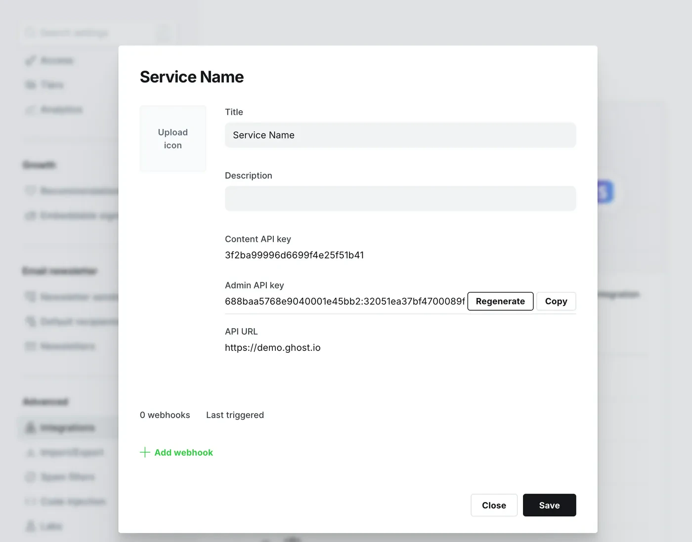 The client requires the host address of your Ghost API and a Content API key in order to authenticate. The version string is optional, and indicates the minimum version of Ghost your integration can work with. The Content API URL and key can be obtained by creating a newCustom Integration under the Integrations screen in Ghost Admin.