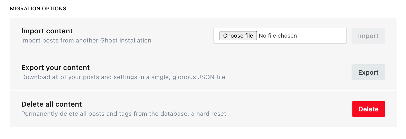 If you need more control over your backups, or need to back up a Docker installation, the following sections explain how to manually back up different parts of your Ghost site.What’s included: JSON exports are great for moving content between sites, but don’t include email analytics, member engagement data, or comments. For disaster recovery or exact site replication, back up your database and content folder directly.